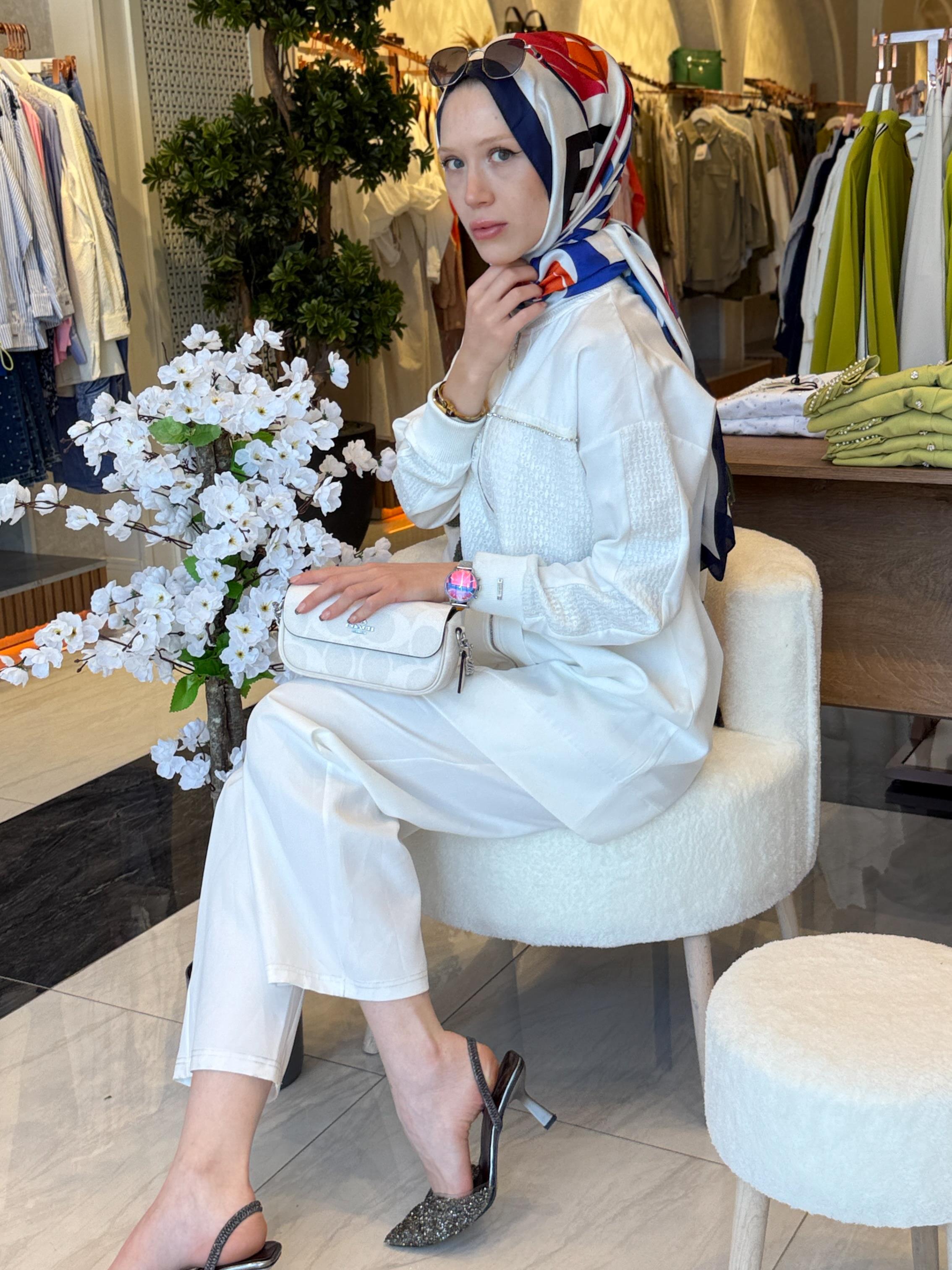 Not: Ürünün 1 beden ölçüleri şu şekildedir; Tunik göğüs: 110 cm, Tunik bel: 112 cm, Tunik basen: 120 cm, Tunik boy: 83 cm, Pantolon bel: 70 cm, Pantolon boy: 104 cm’dir