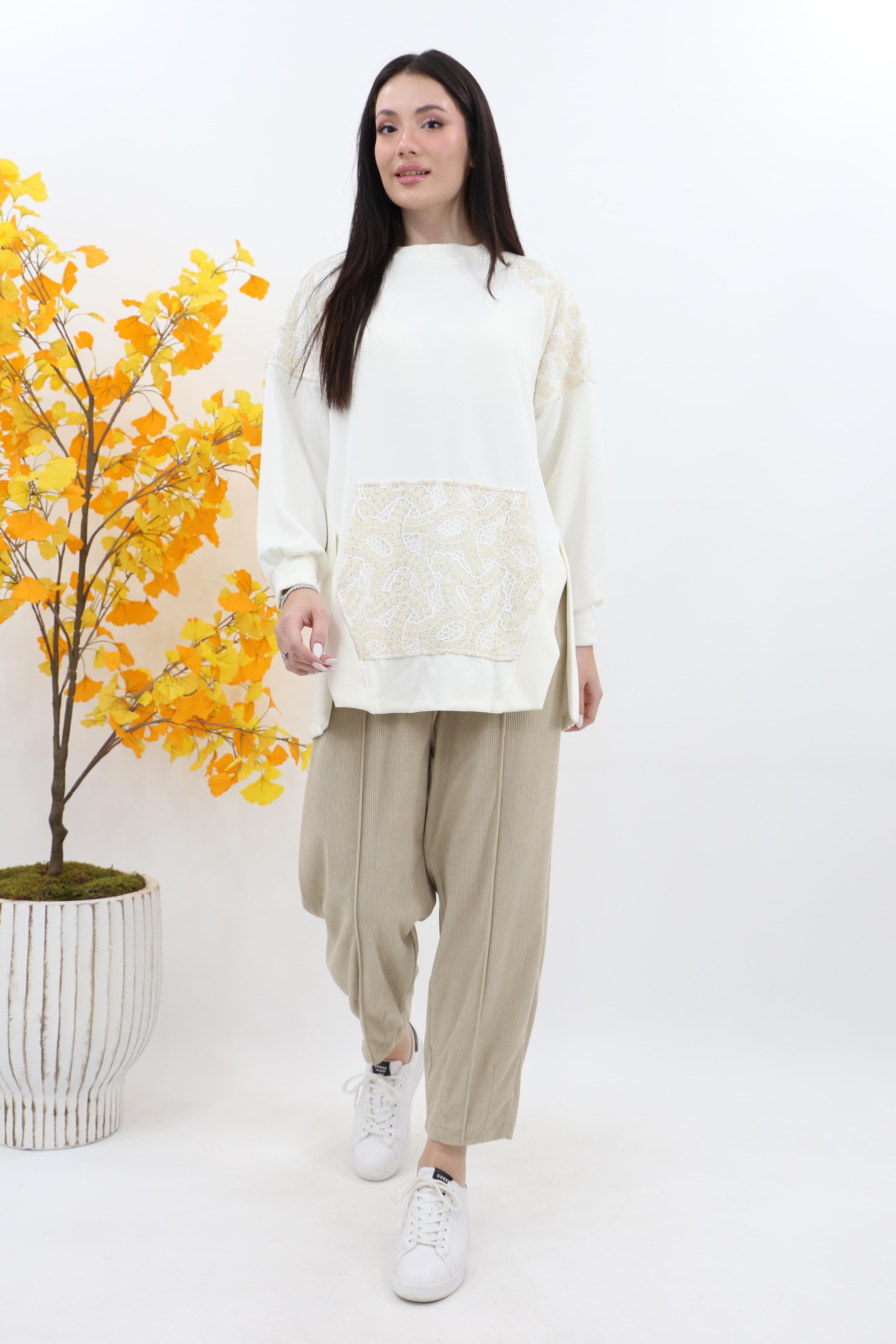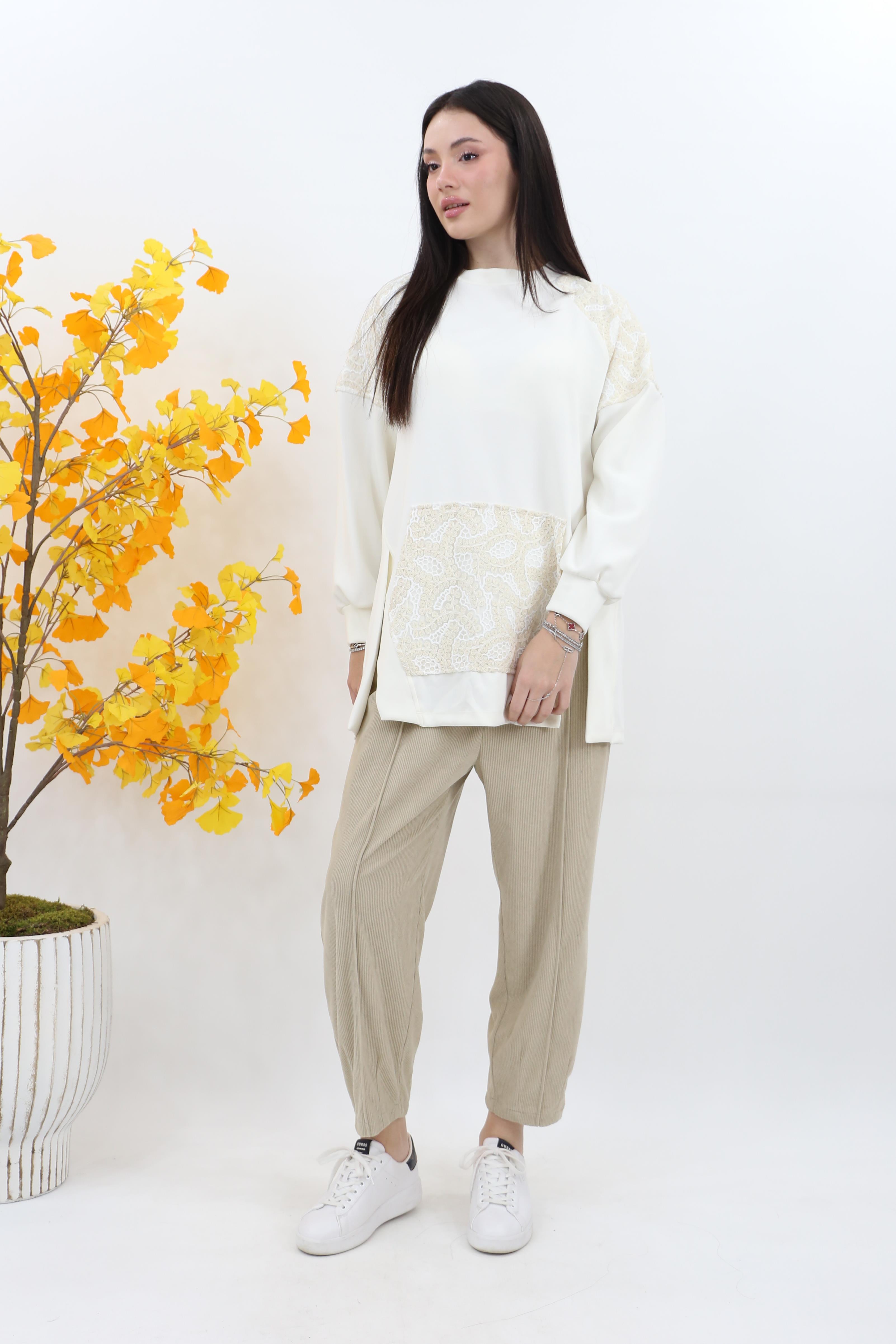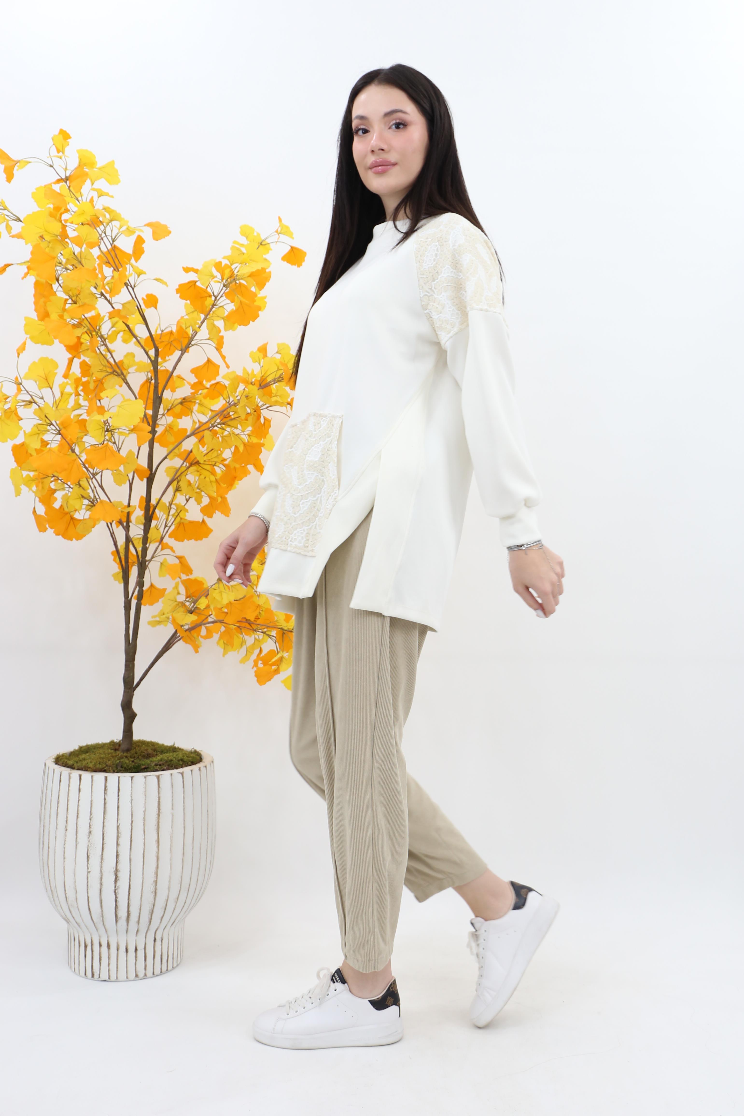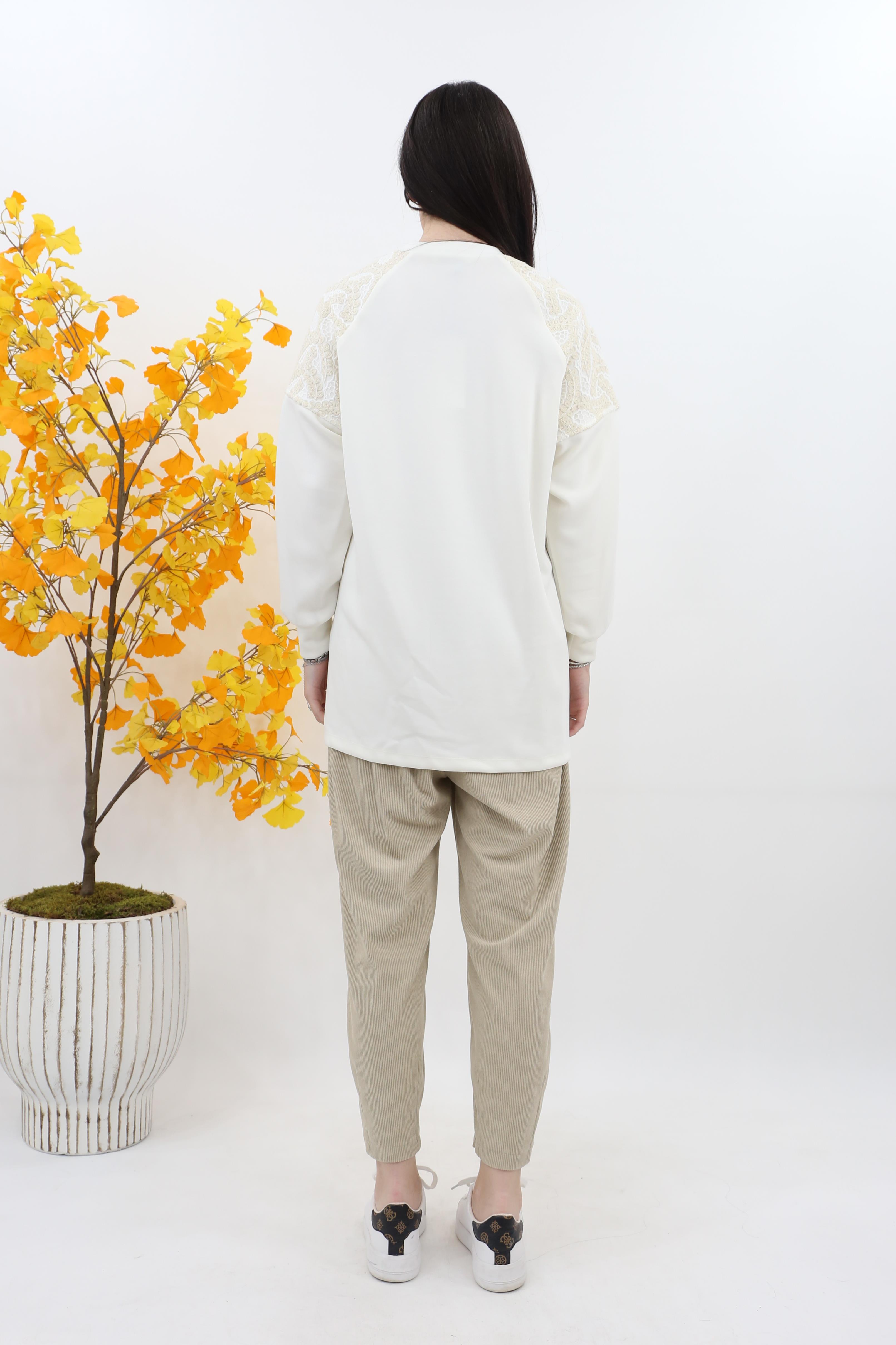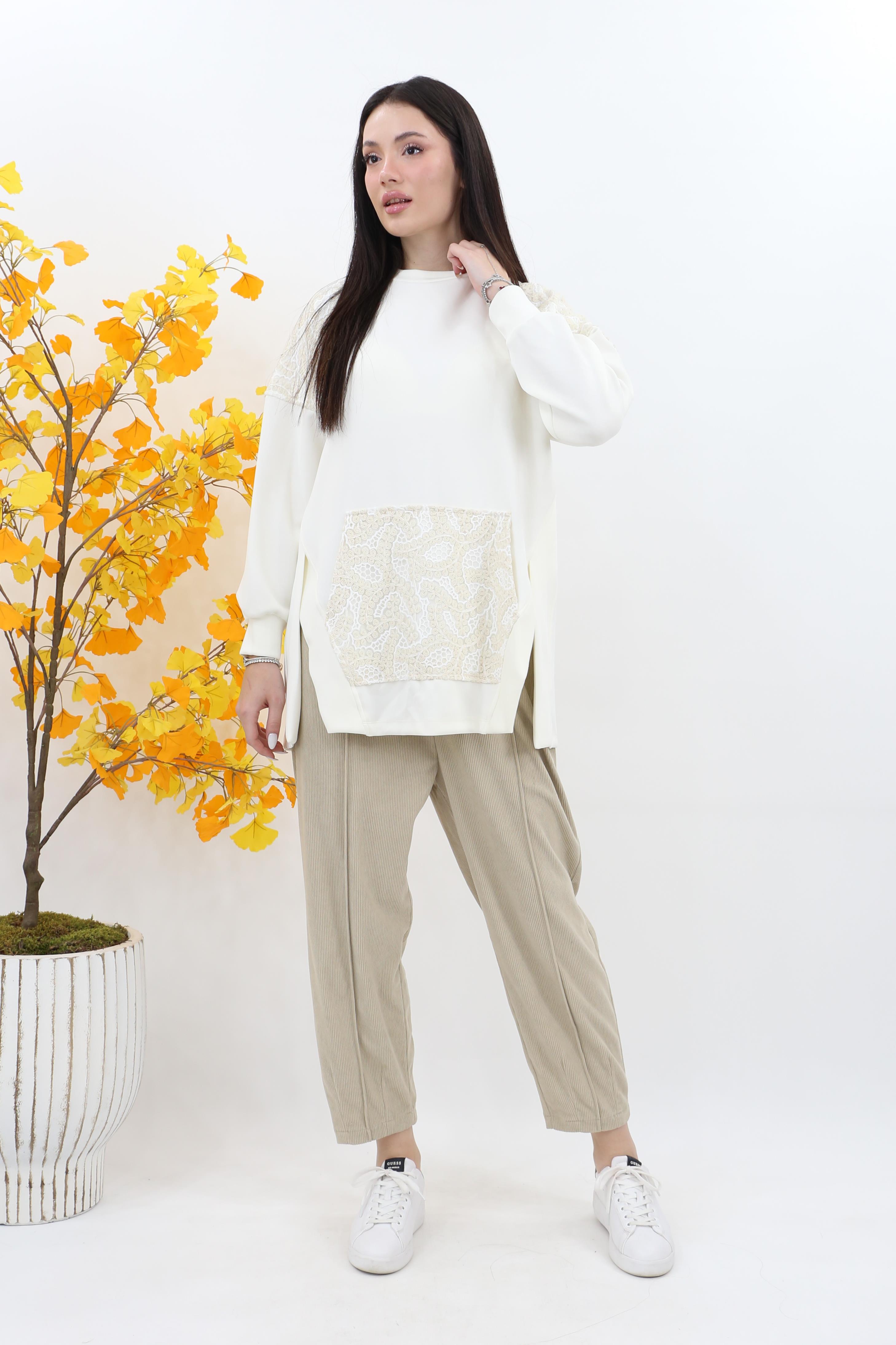 Puane Çiçek Garnili Kanguru Cep Modal Tunik 10624 - Ekru (4880)