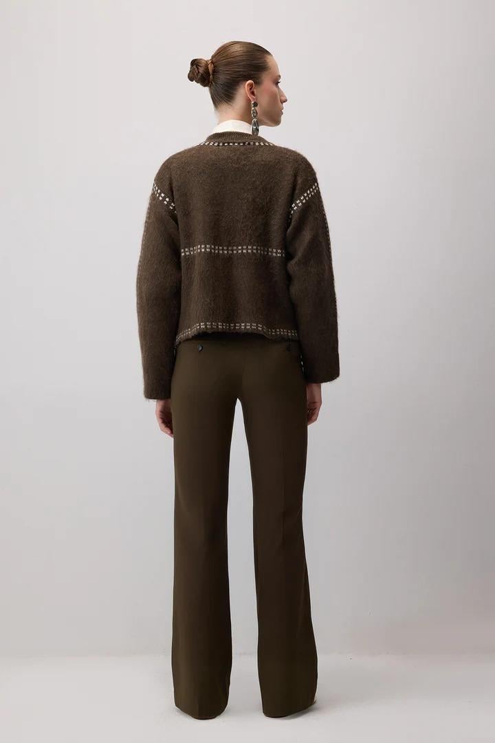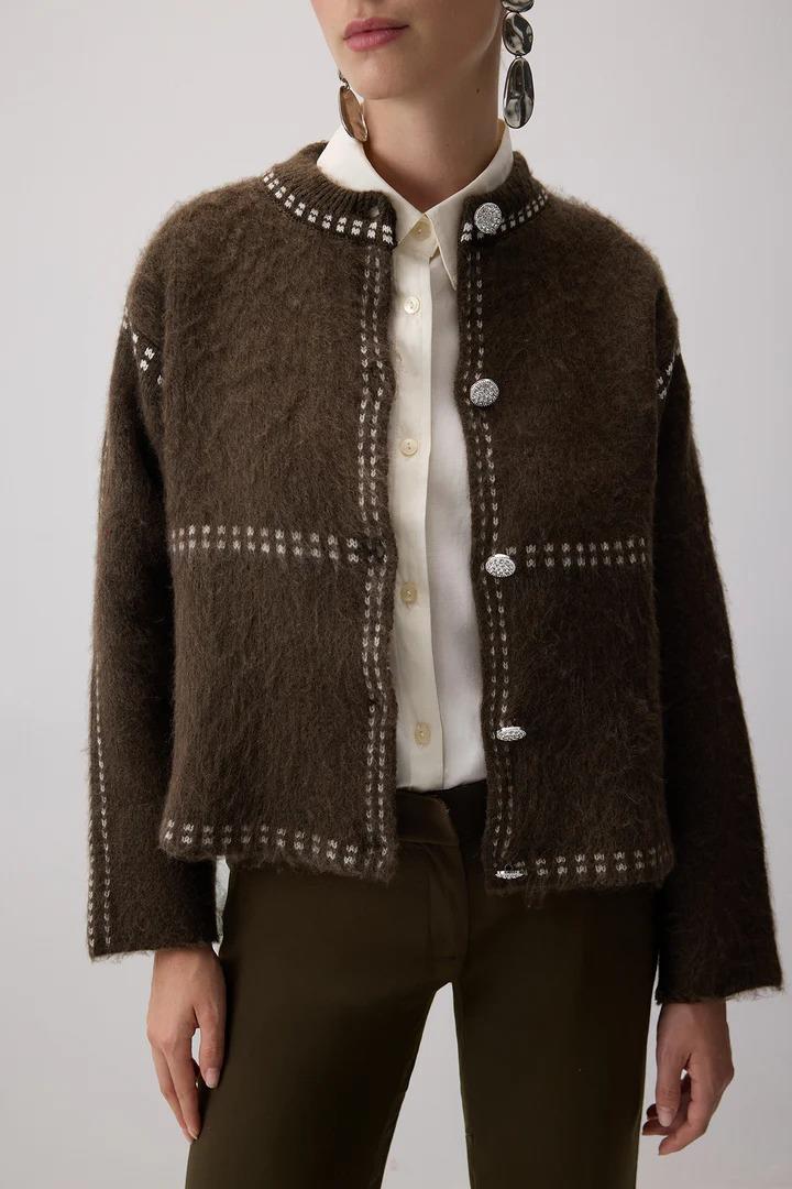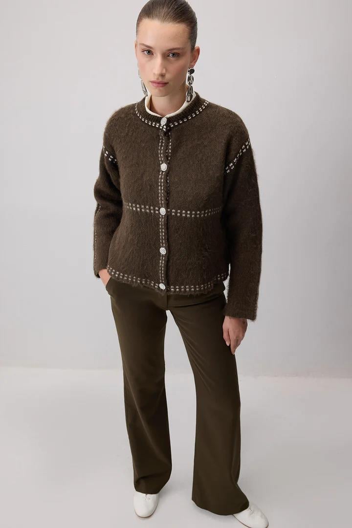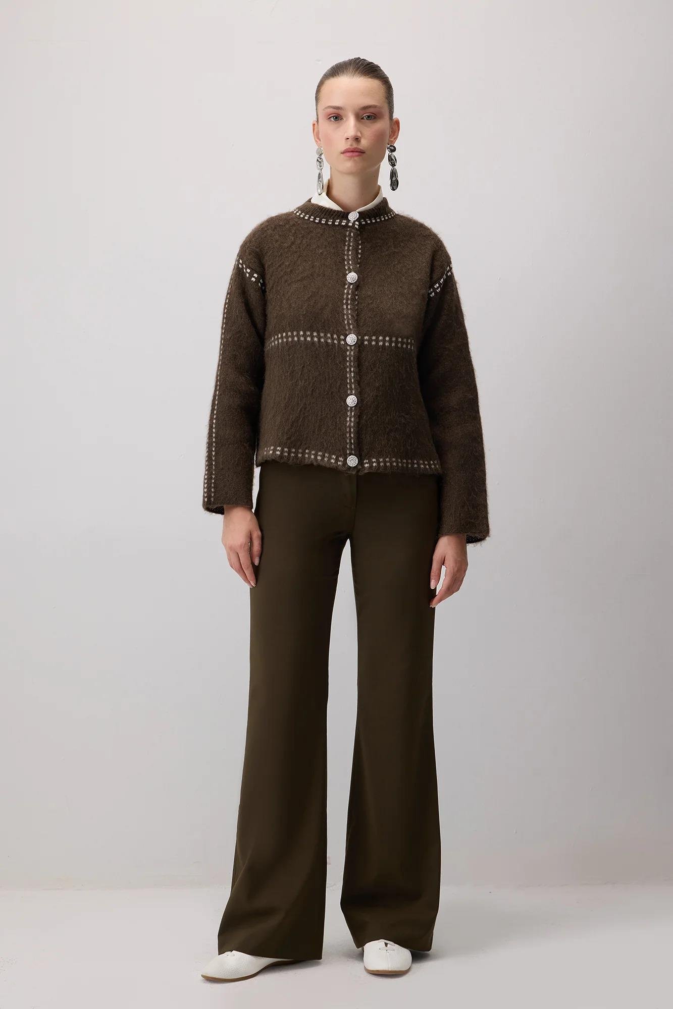 Touche Şardonlu Kontrast Hırka - Kahve (4991)